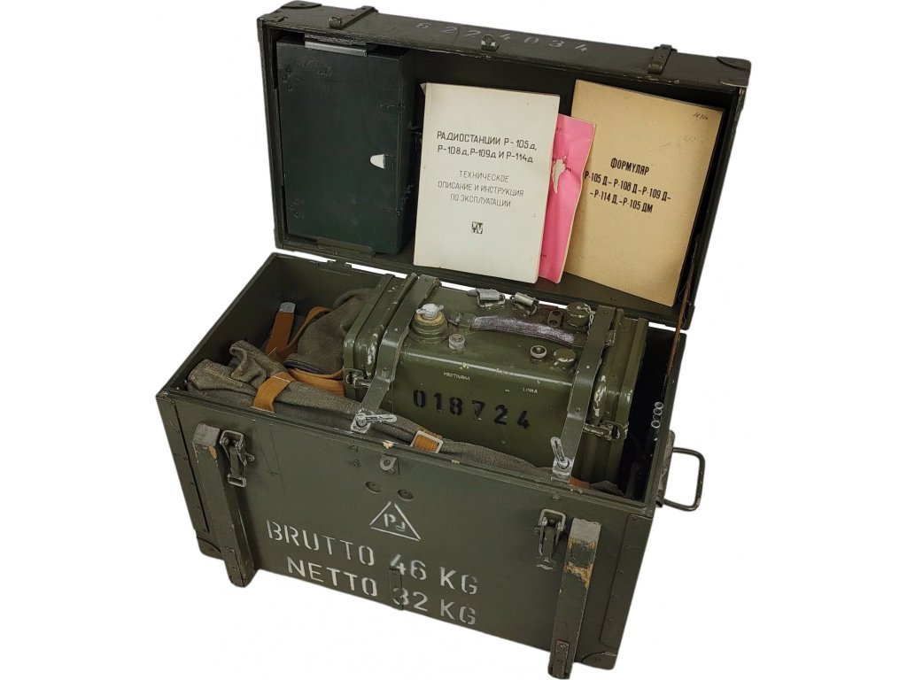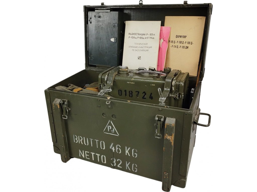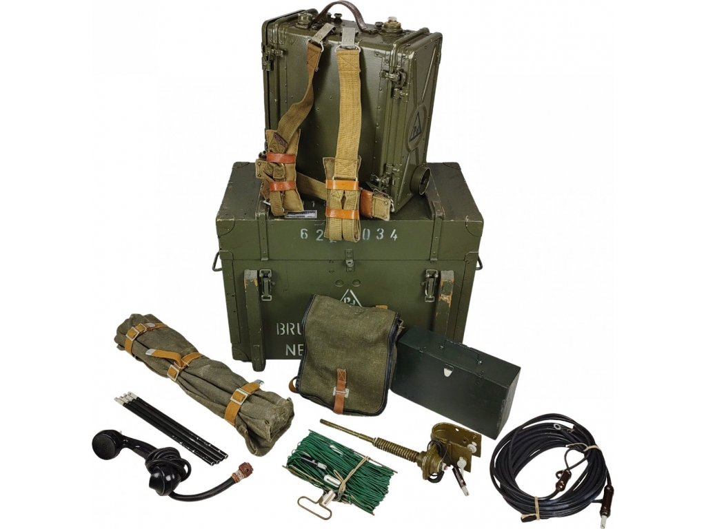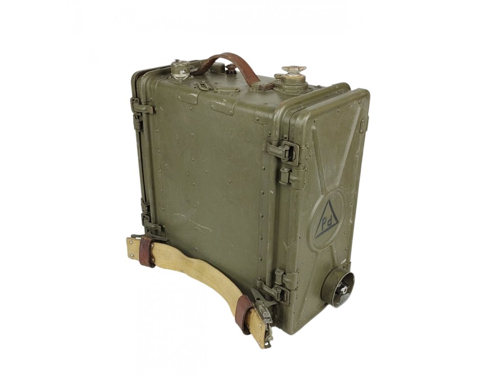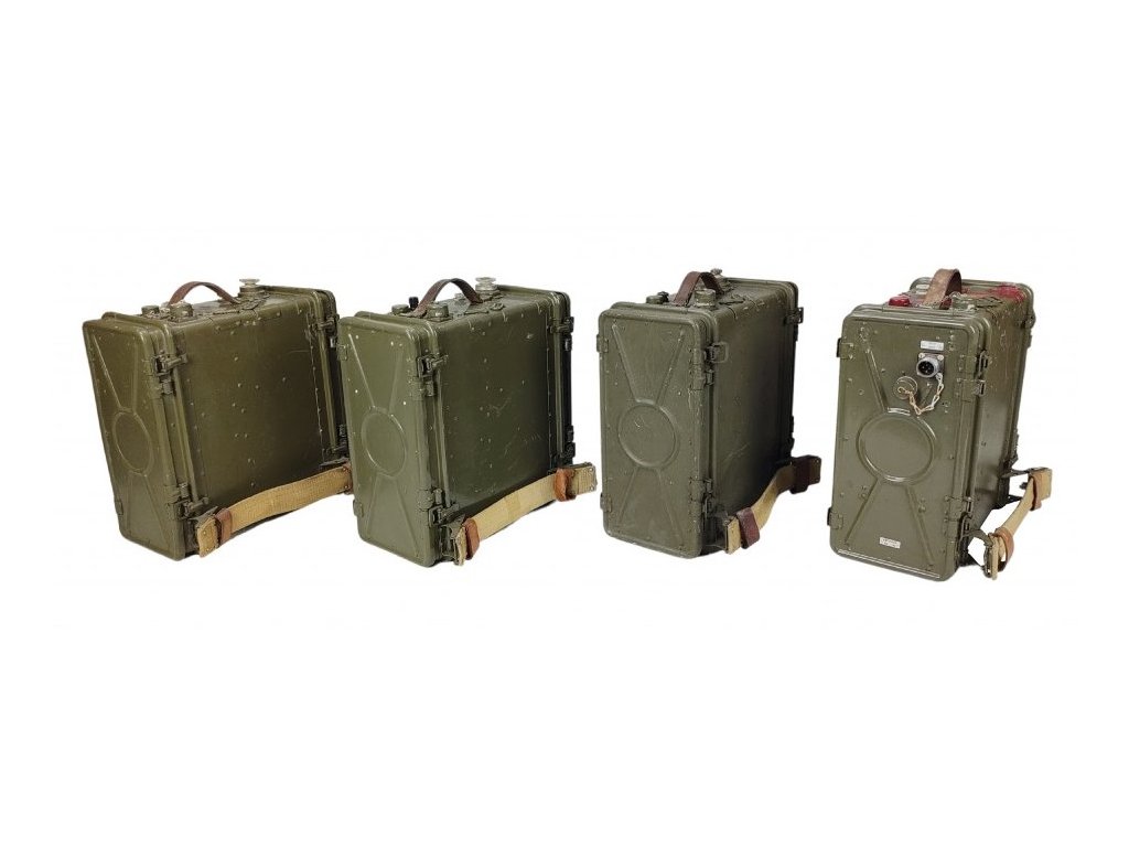 - součástí rádiová stanice, zádové popruhy, bederní pás, anténa, manuál ,dřevěná transportní bedna k uložení viz. fotografie
