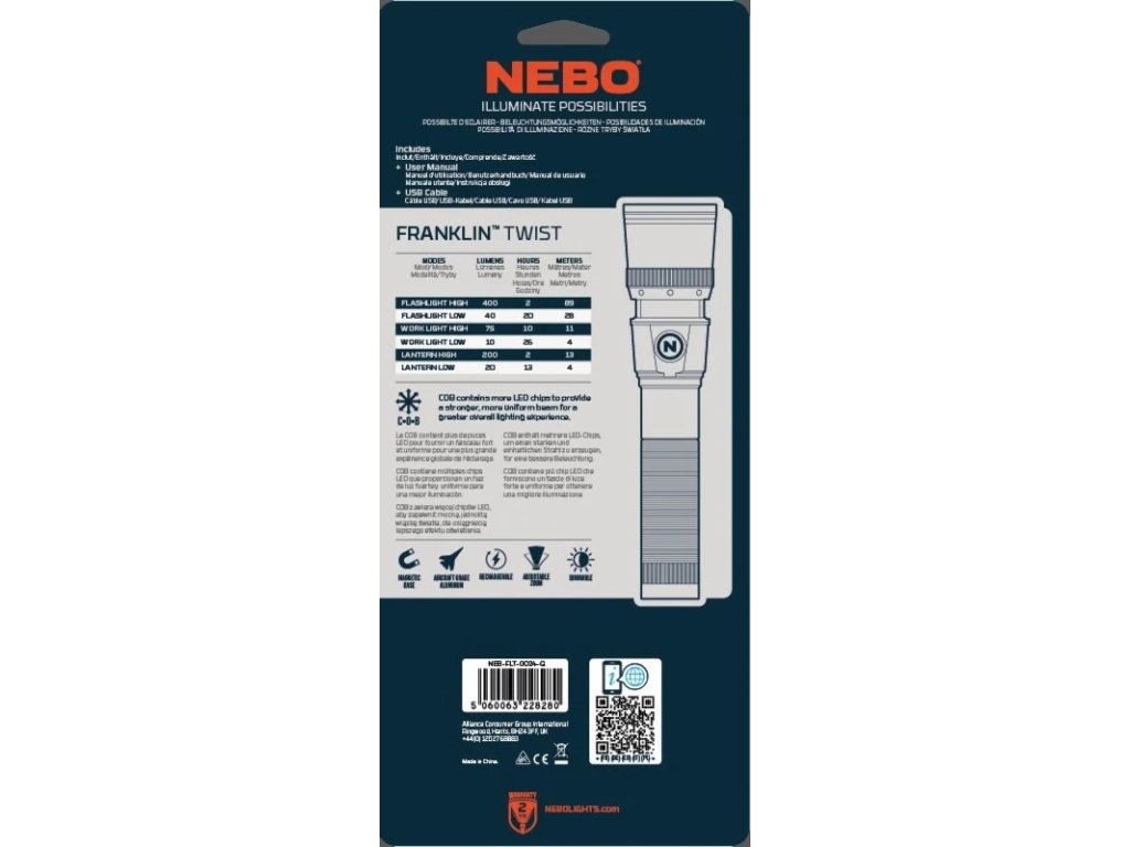 Franklin™ Twist od značky Nebo je výkonná dobíjecí ruční svítilna a pracovní světlo se 6 světelnými režimy. Twist je vybaven LED prstencem Arcus Cob, který funguje jako pracovní světlo nebo 360° lucerna a výkonný LED čip ve svítilně může svítit až 89 metrů daleko. Přiložená baterie umožňuje mezi nabíjeními až 26 hodin provozu.