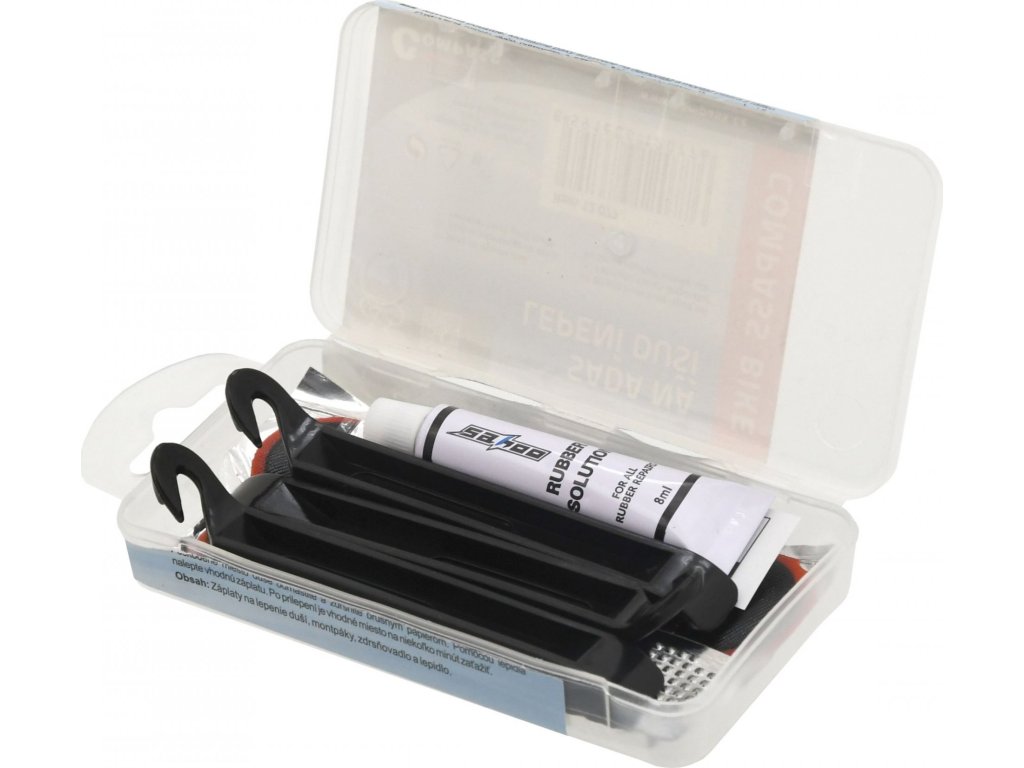- Souprava potřebných pomůcek pro opravu duší včetně montážní páky (montpák) pro demontáž pláště z kola.