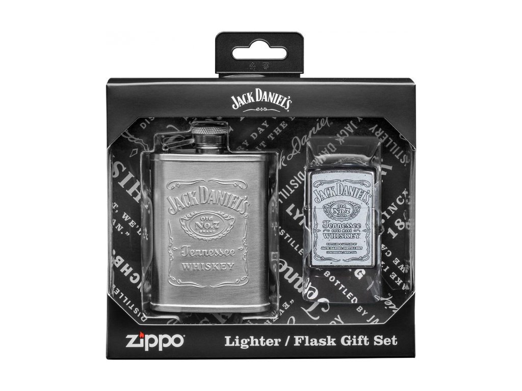 Zippo® zapalovač s povrchem Satin Chrome potištěný světoznámým motivem Jack Daniel's® Old. No. 7 v dárkové sadě s odpovídajícím motivem vyraženým do luxusní placatky z prvotřídní nerez oceli. Baleno v průhledném dárkovém balení ve stylu Jack Daniel's®.