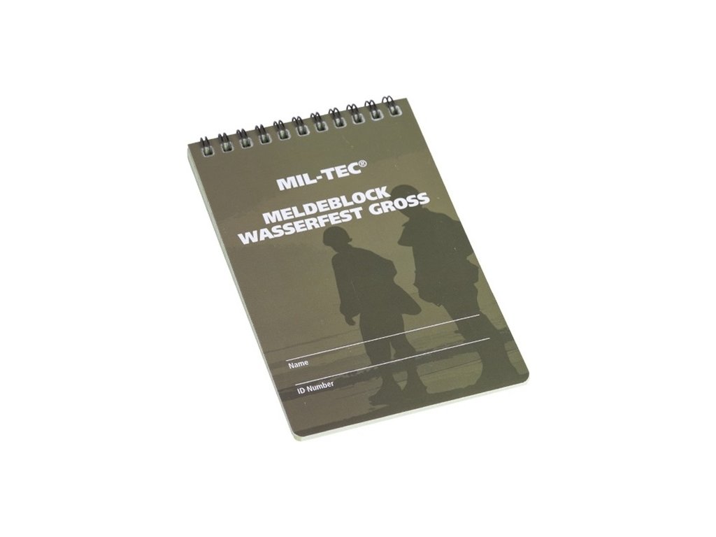 Jedná se o velký voděodolný zápisník (notes) značky MIL-TEC®, známý jako "Meldeblock Wasserfest Gross".
