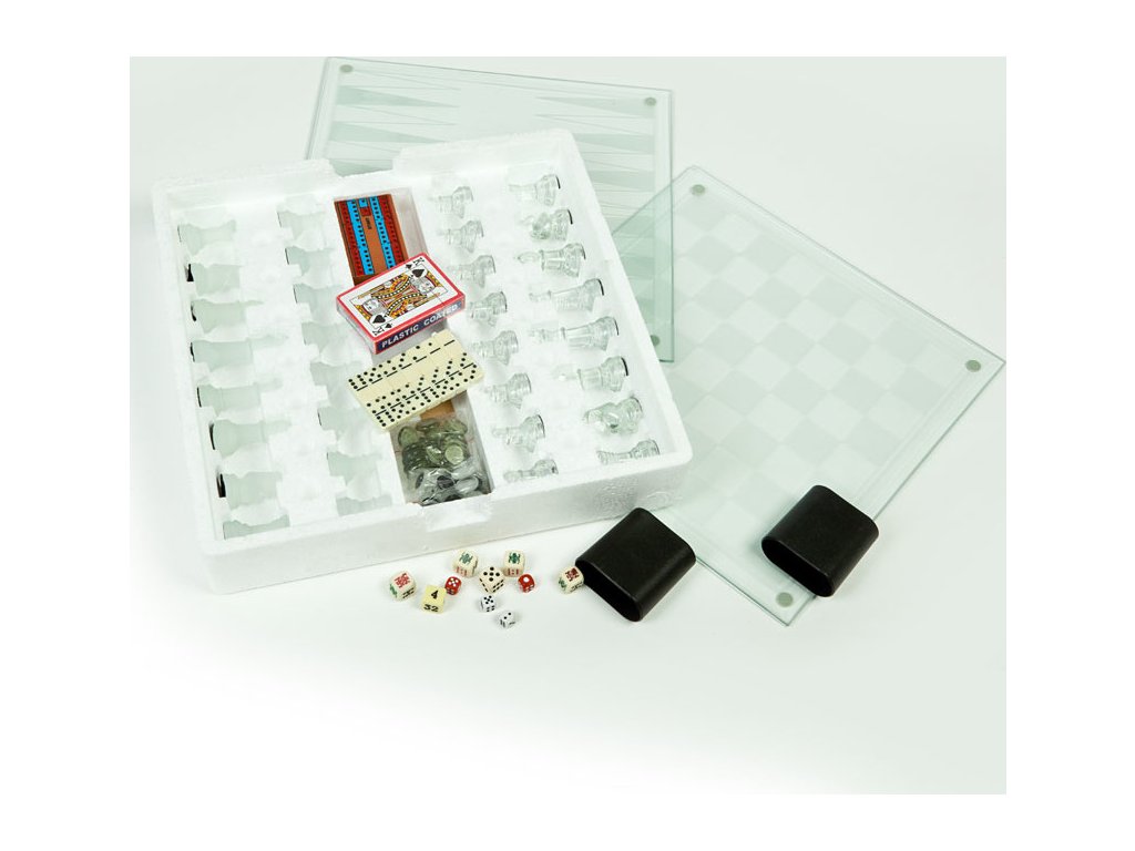- Výjimečný set sedmi her v jednom: šachy, vrhcáby, dáma, domino, karty, pokerové kostky a cribbage.