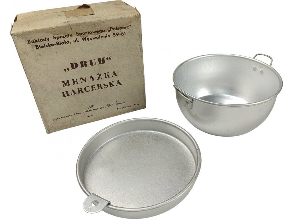 Historická polská skautská jídelní souprava (menażka) značky "Druh" ze 70. let, vyrobená v Bielsko-Biała. Pochází z produkce podniku "Polsport".
