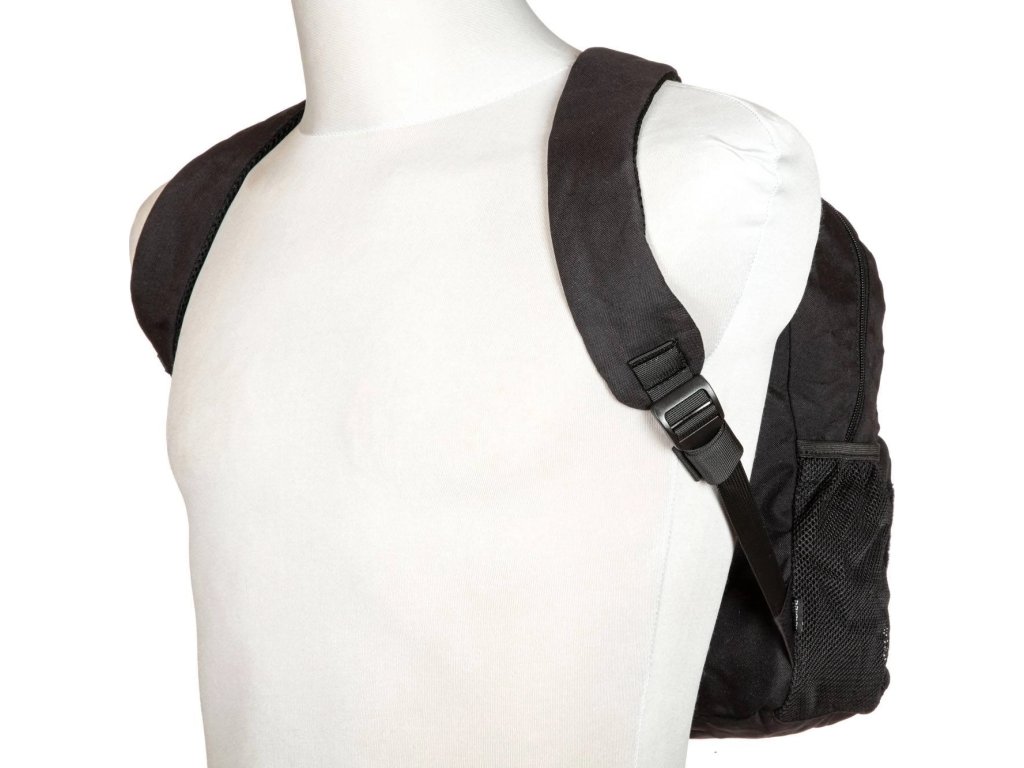 - Na bocích batohu najdete hluboké síťované kapsy, do kterých se vejde láhev s vodou.