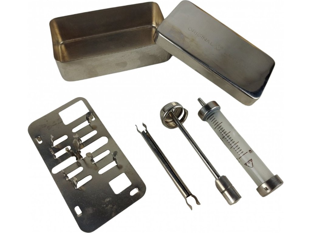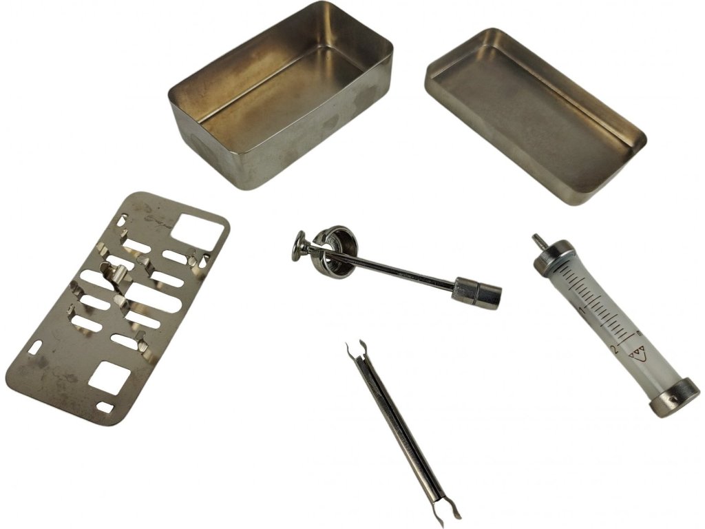 Z lihu (éteru) vyberte píst a skleněný válec po uplynutí 2 minut a vyvařte po dobu 5 minut v 1% roztoku sody (vodný roztok), aby se odstranili všechny zbytky léčiv.