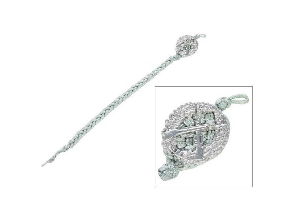 - Kvalitní, zdobená slavnostní šňůra s kovovým odznakem motivu dvou zkřížených pušek na vavřínovém listí.