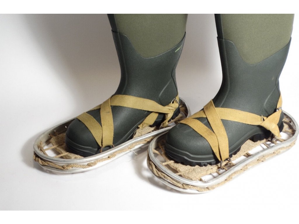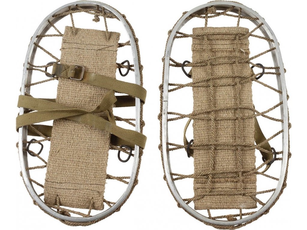 - Lehké vintage sněžnice s hliníkovým rámem, lněným lůžkem, a nastavitelným páskem kolem kotníku.