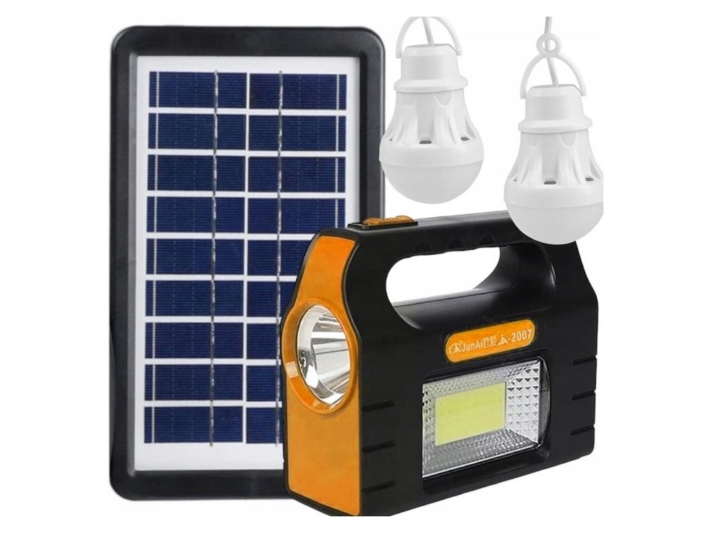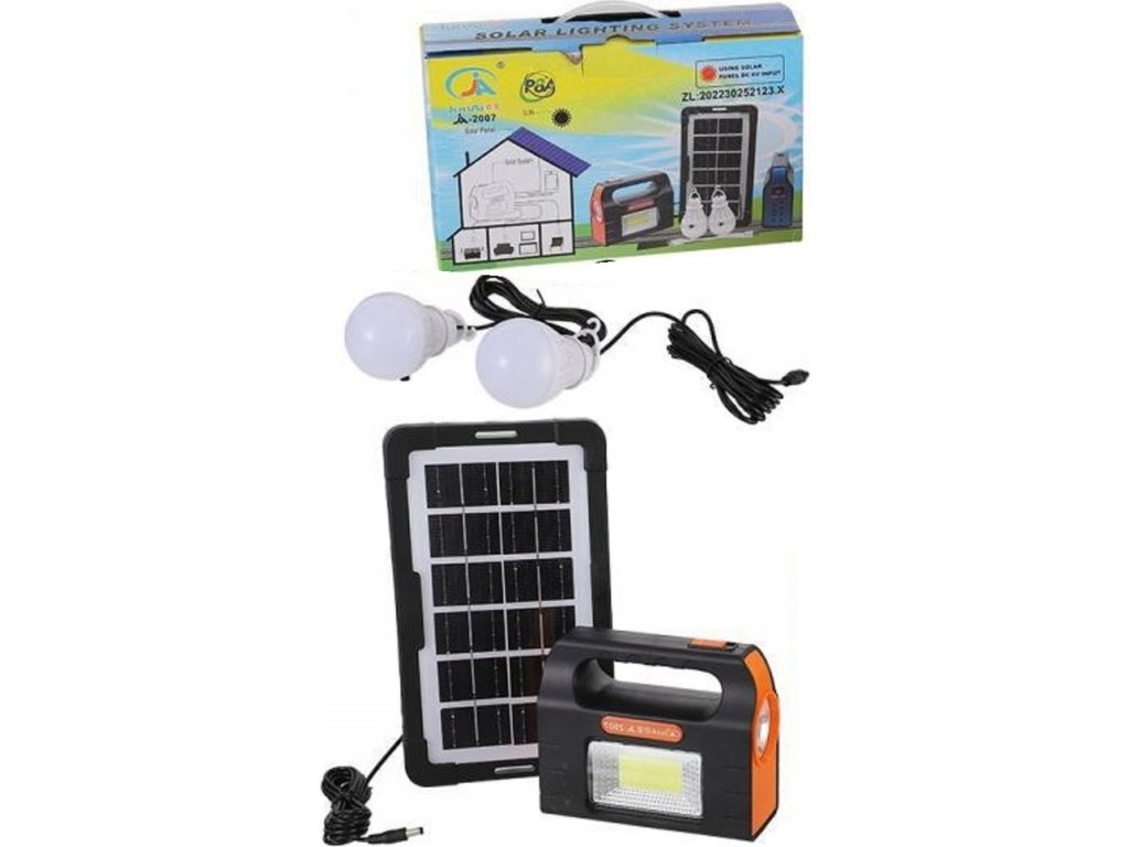 Multifunkční solární systém pro osvětlení (nabíjecí stanice, solární panel, dvě LED žárovky, nabíjecí kabeláž) JA-2007
