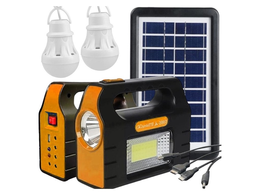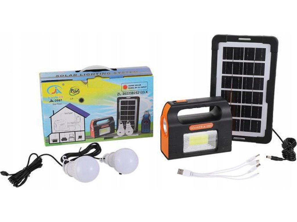 Představujeme multifunkční systém JA-2007, mobilní fotovoltaický set se solární nabíječkou. Sada obsahuje solární panel, baterii 3500 mAh, svítilnu, dvě LED žárovky a nabíjecí kabel pro různé vychytávky.