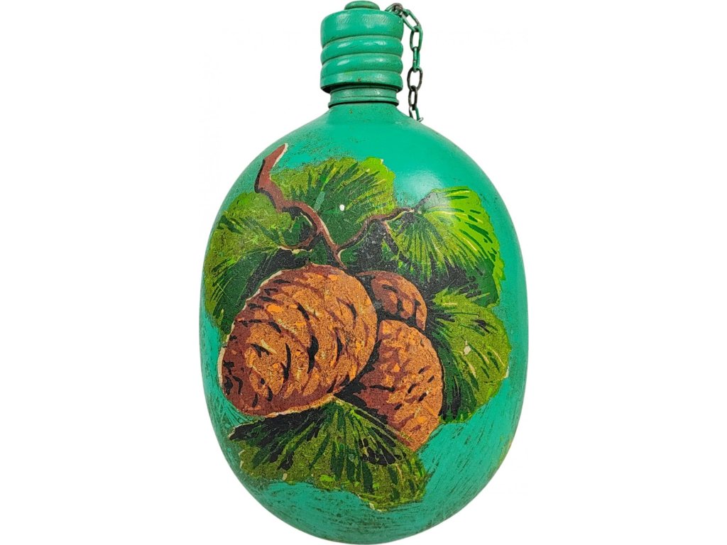 Sovětská hliníková polní láhev (čutora) se šroubovacím uzávěrem, který je proti ztrátě připevněn řetízkem. Láhev má oválný tvar a původně zelený vojenský nátěr, který je v tomto případě navíc ručně pomalován motivem šišek a listů.