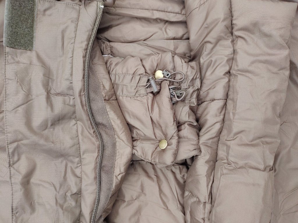 - V oblasti ramen všitý zateplovací límec, jeho volné překrývající se konce lze sepnout dvěma druky