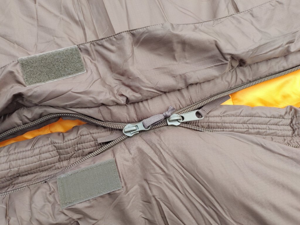 Zapínání – uprostřed horního dílu pytle je všité dvoucestné spirálové zdrhovadlo šířky (10 ±1) mm a délky (1500 ±50) mm. Každý jezdec zdrhovadla je opatřen tahačem, který napomáhá komfortnější manipulaci. Zdrhovadlo je z horní strany kryté chlopní, (100 ±10) mm širokou horní légou, zajištěnou třemi stuhovými uzávěry o rozměrech (30 ±5) mm x (70 ±5) mm. Ze spodní strany je zdrhovadlo překryté zateplenou (90 ±10) mm širokou légou. Spodní léga je několikrát podélně prošitá a na straně u zdrhovadla je našité podložení z popruhu. Zdrhovadlo je na obou koncích zajištěno proti vytržení.