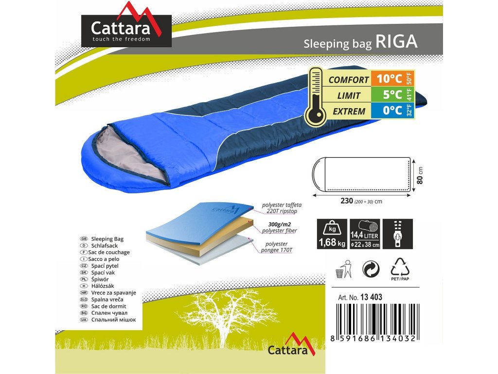 - Spacák Riga je vybaven třemi vrstvami, vnější materiál je polyester taffeta 220T s povrchovou úpravou Rip-Stop, díky které se případné vzniklé trhliny materiálu dále nezvětšují.