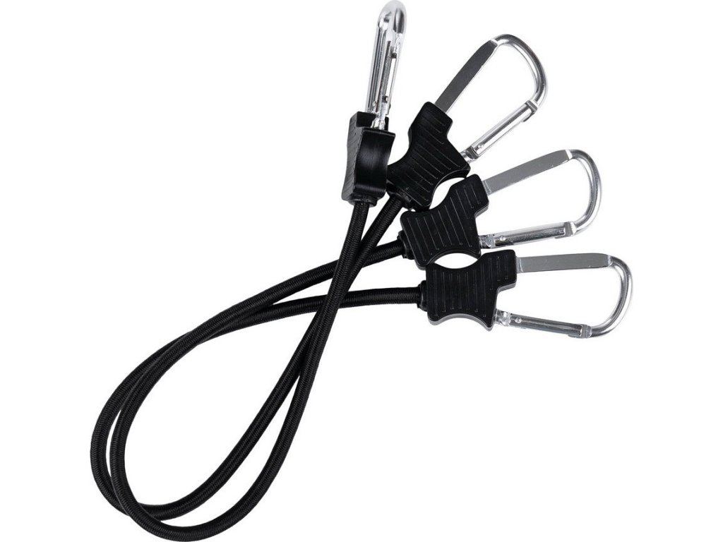 Tyto bungee šňůry jsou vyrobeny z elastického materiálu (gumové lano potažené textilií) a na obou koncích mají kovové karabiny, které zůstávají připevněné bez ohledu na napětí.