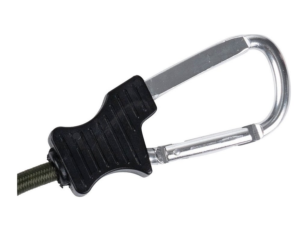 Silná guma nabízí flexibilitu a napětí, zatímco karabina zajišťuje bezpečné a snadné upevnění.