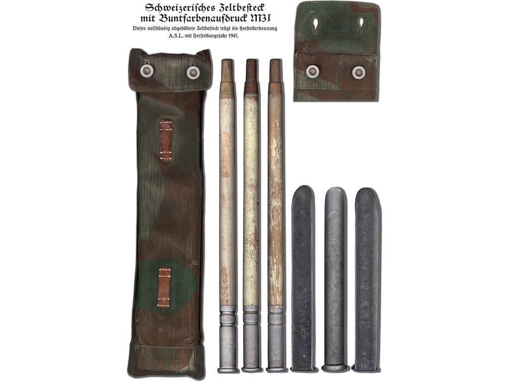 Originální švýcarské kovové kolíky a dřevěné tyče včetně obalu, model M-1931 (někdy také pod označením M-1938), pocházející z období druhé světové války WWII. Původně určeny jako součástka k postavení polostanu, neboli armádní plátěné maskovací celty jednotlivce. V období druhé světové války používalo Švýcarsko maskování celt, adoptované a lehce upravené z německého vzoru "Splittertarn" jednotek Wehrmacht.