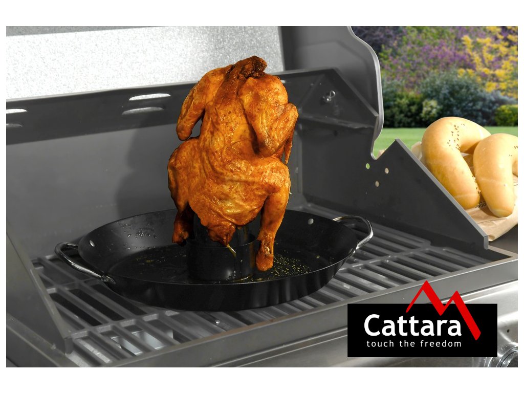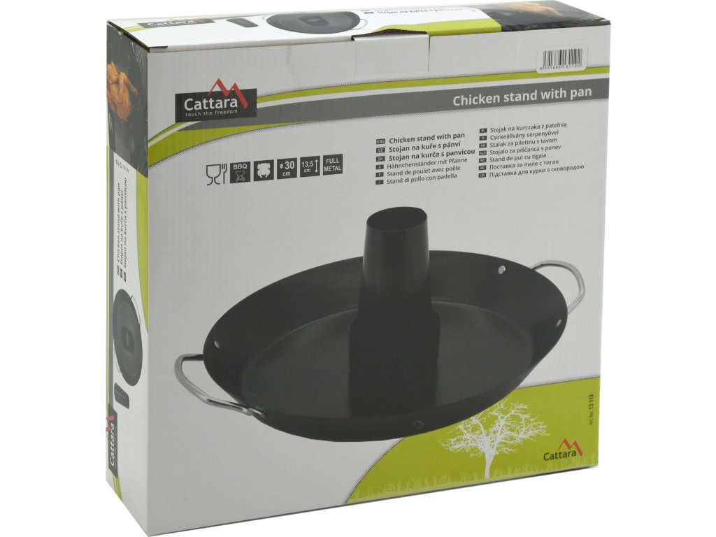 - Pánev je vyrobena z kvalitní oceli černé barvy s průměrem 30 cm a hloubkou 3,7 cm. Do pánve stéká tuk z grilovaného kuřete, je však možné nalít např. pivo, případně jinou marinádu a nechat grilující se kuře absorbovat danou chuť. Případně je možné na pánvi spolu s kuřetem grilovat např. i zeleninu.