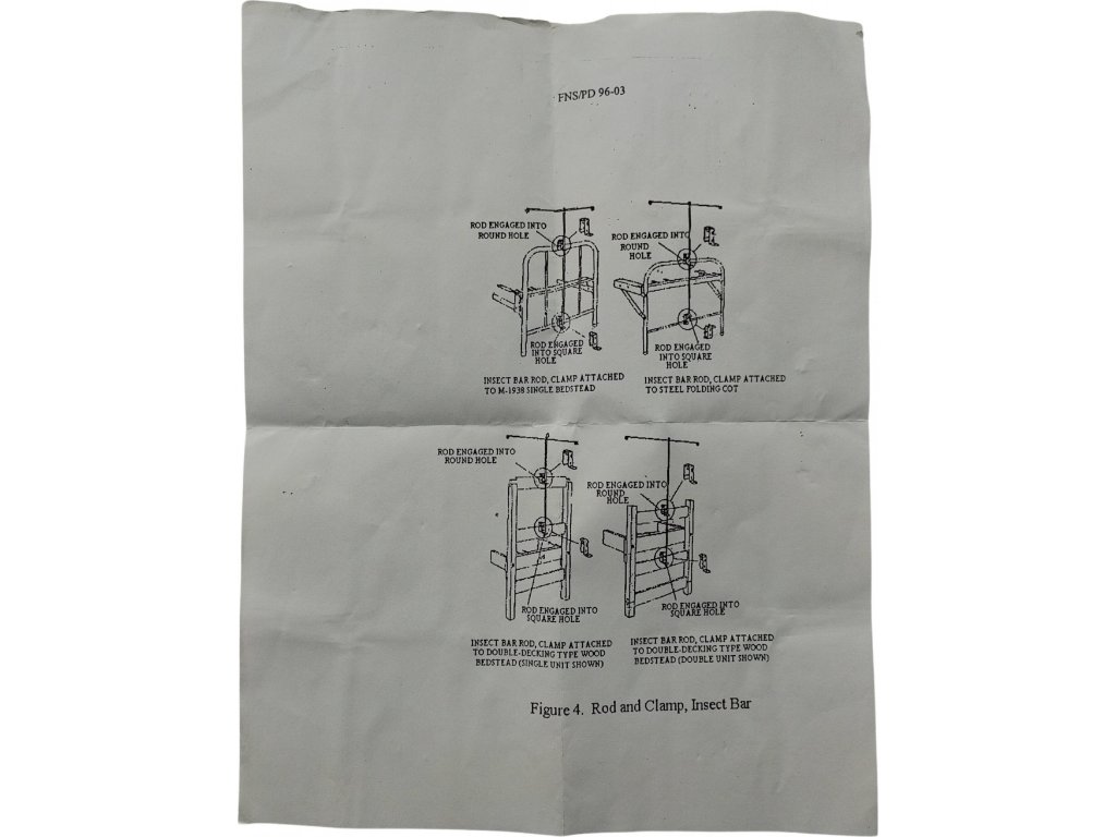 Svorka speciálně navržená pro připevnění tyče k různým typům vojenských přistýlek a postelí za účelem podepření SÍTĚ PROTI HMYZU/MOSKYTIÉRY (INSECT NET PROTECTOR). Kovová svorka, která drží na velkých ocelových tyčích a drží moskytiéru na místě nad postelí. Funguje na kovových i dřevěných typech paland. Upínají se přímo k rámu polního lůžka nebo nemocniční palandy.