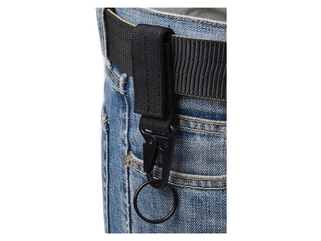 Klip na opasek: kovová karabina a kroužek, zbytek je vyroben z velmi odolného syntetického nylonového materiálu.