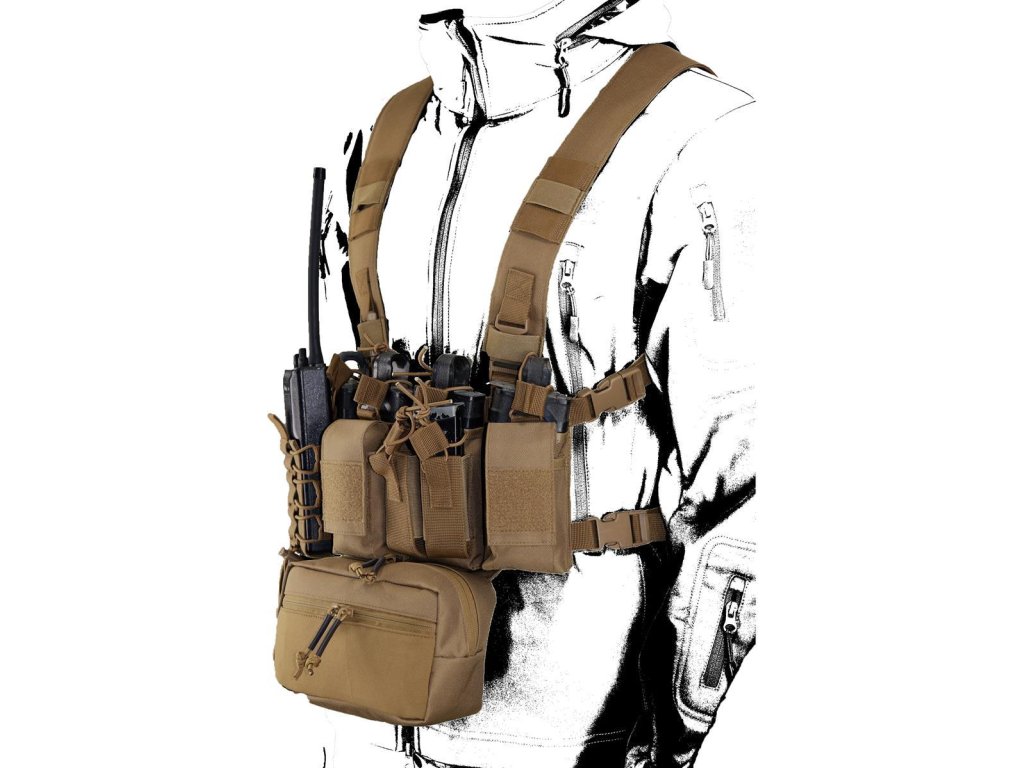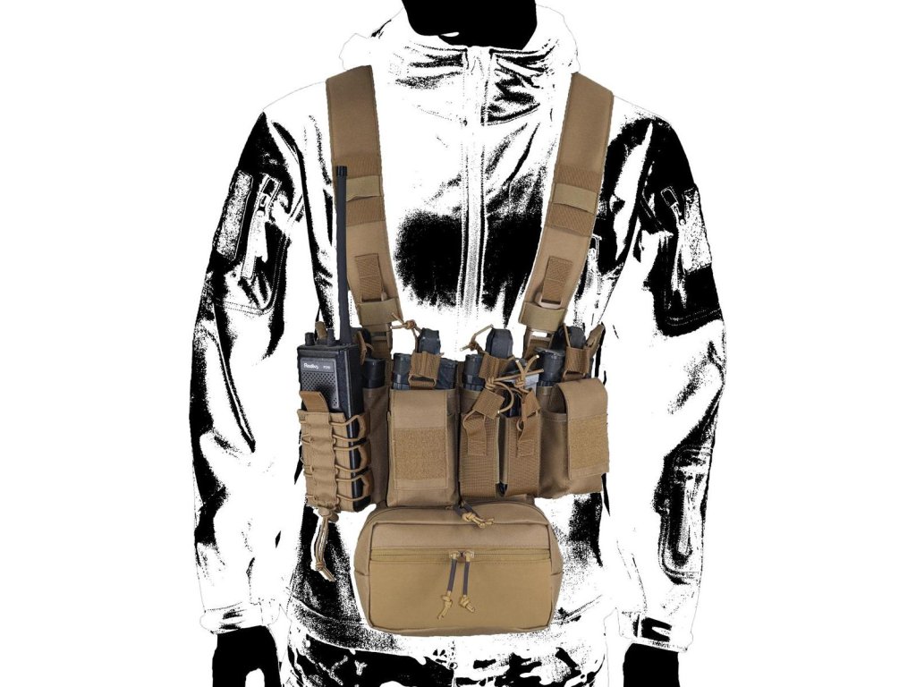 Moderní taktické vybavení pro aktivní střelce. Vyrobeno z vysoce kvalitního materiálu Cordura® 500D, který se vyznačuje vysokou odolností proti mechanickému poškození a díky PU úpravě, odolnosti vůči sněhu a vodě. Tato víceúčelová hrudní souprava se používá k uložení munice, zásobníků a dalších důležitých věcí. Je vybavena klokaní kapsou která obsahuje elastické proužky pro uložení vybavení. Nastavitelné polstrované ramenní popruhy a nastavitelný zadní popruh X umožňuje, aby se Chest Rig přizpůsobil jakékoli velikosti.