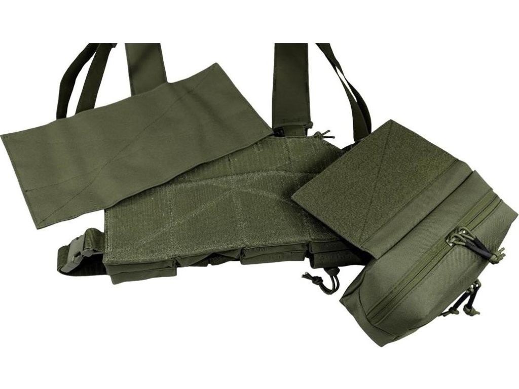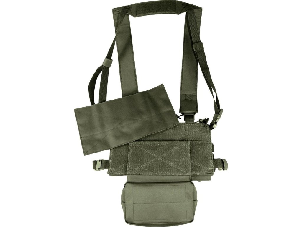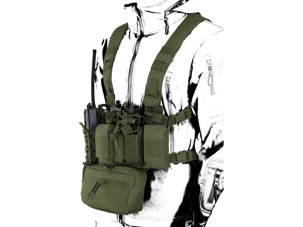 Moderní taktické vybavení pro aktivní střelce. Vyrobeno z vysoce kvalitního materiálu Cordura® 500D, který se vyznačuje vysokou odolností proti mechanickému poškození a díky PU úpravě, odolnosti vůči sněhu a vodě. Tato víceúčelová hrudní souprava se používá k uložení munice, zásobníků a dalších důležitých věcí. Je vybavena klokaní kapsou která obsahuje elastické proužky pro uložení vybavení. Nastavitelné polstrované ramenní popruhy a nastavitelný zadní popruh X umožňuje, aby se Chest Rig přizpůsobil jakékoli velikosti.