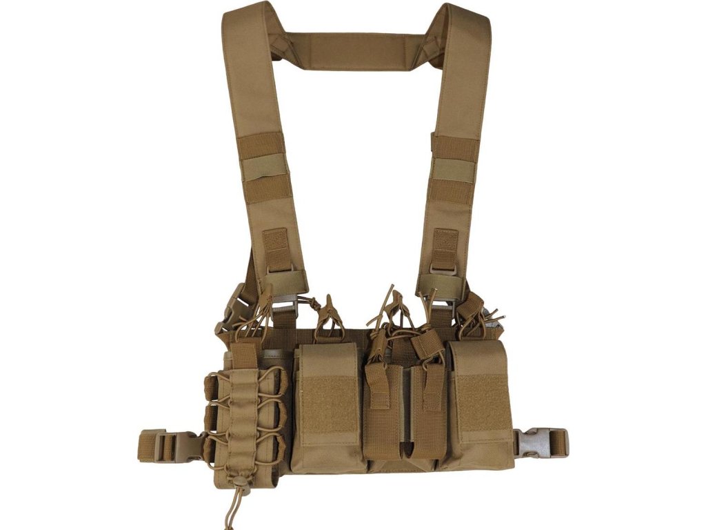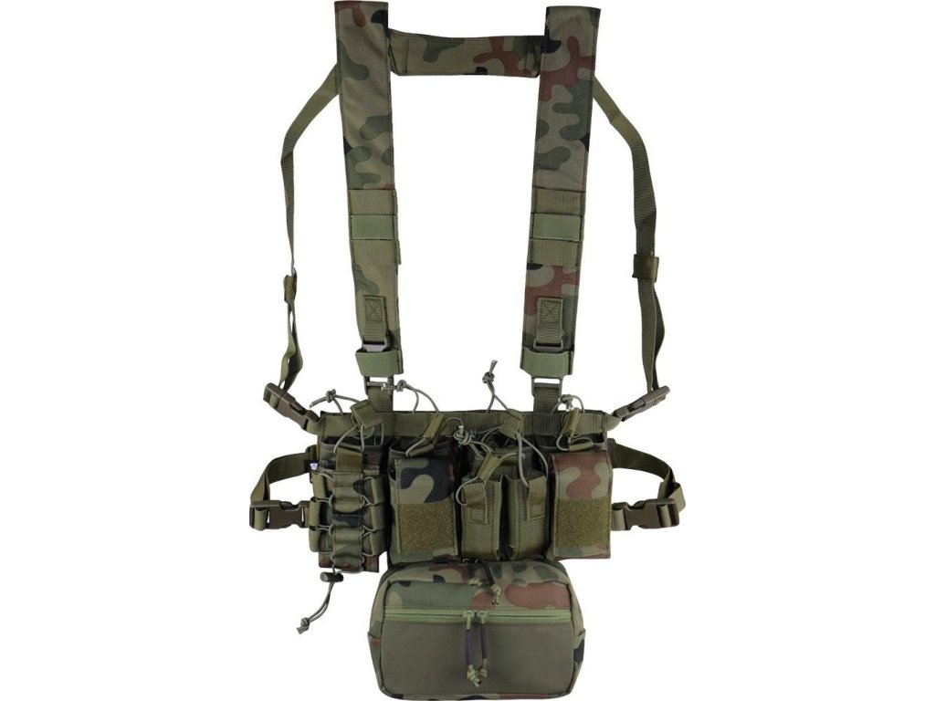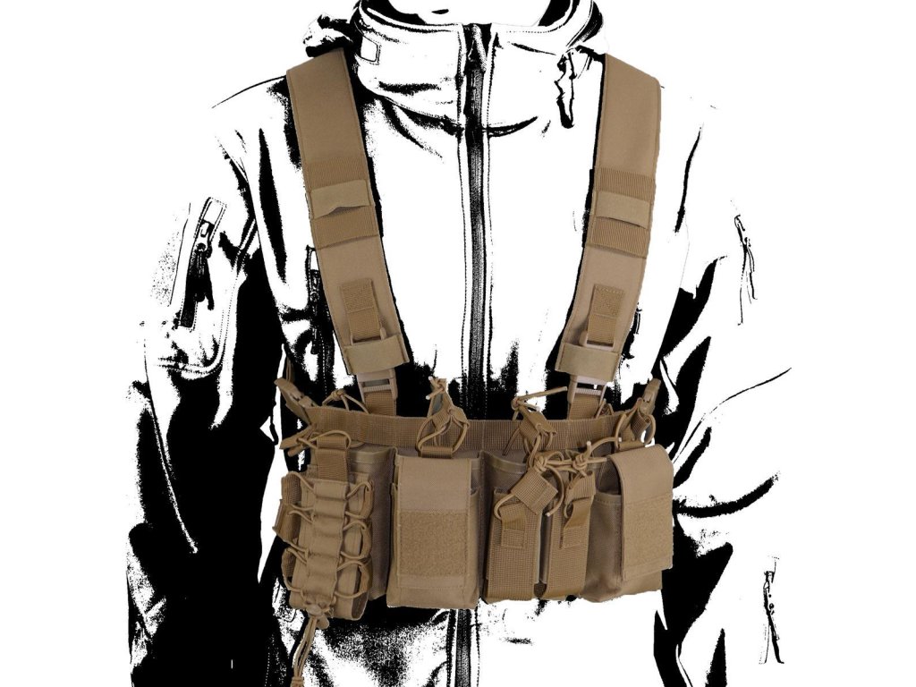 Moderní taktické vybavení pro aktivní střelce. Vyrobeno z vysoce kvalitního materiálu Cordura® 500D, který se vyznačuje vysokou odolností proti mechanickému poškození a díky PU úpravě, odolnosti vůči sněhu a vodě. Tato víceúčelová hrudní souprava se používá k uložení munice, zásobníků a dalších důležitých věcí. Je vybavena klokaní kapsou která obsahuje elastické proužky pro uložení vybavení. Nastavitelné polstrované ramenní popruhy a nastavitelný zadní popruh X umožňuje, aby se Chest Rig přizpůsobil jakékoli velikosti.