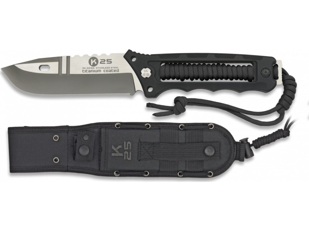 - Na konci rukojeti dvě očka s průvlekem, opatřené paracord šňůrou, konec rukojeti lze zároveň použít k efektivnímu rozbíjení okna.
