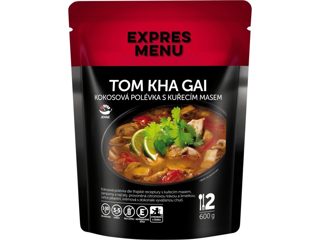 Tom Kha Gai od EXPRES MENU je tradiční thajská kokosová polévka s kuřecím masem, která nabízí originální exotickou chuť a poctivé suroviny. Polévka je připravena metodou sterilace, díky čemuž neobsahuje konzervanty ani chemická dochucovadla a zároveň není nutné ji skladovat v chladu.