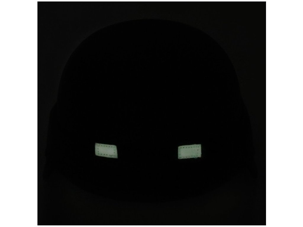 Elastický pásek je navržen tak, aby zajistil kryt přilby na místě, zatímco kočičí oči na zádech svítící ve tmě pomáhají při viditelnosti za slabého osvětlení. Americké razítko naznačuje vojenskou emisi, i když tato konfigurace není široce zaznamenána.