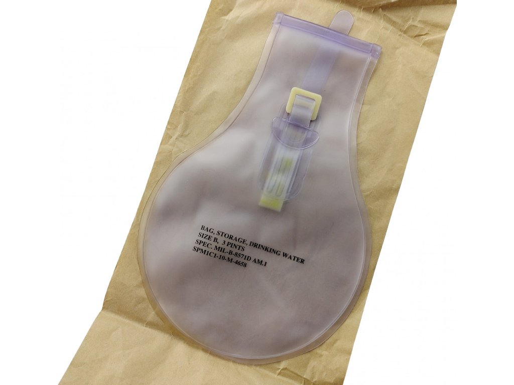 Oficiální armádní skladovací název: BAG, DRINKING WATER, PLASTIC W/ROLL, BUCKLE CLOSURE, 3 PINT PER MIL-B-8571D