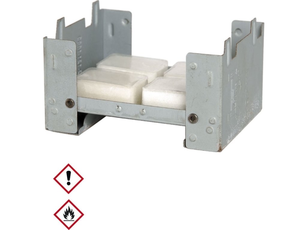 - Klasický skládací plechový vařič na pevný líh / ohřívač na tuhý líh, včetně balení pevných lihových tablet.