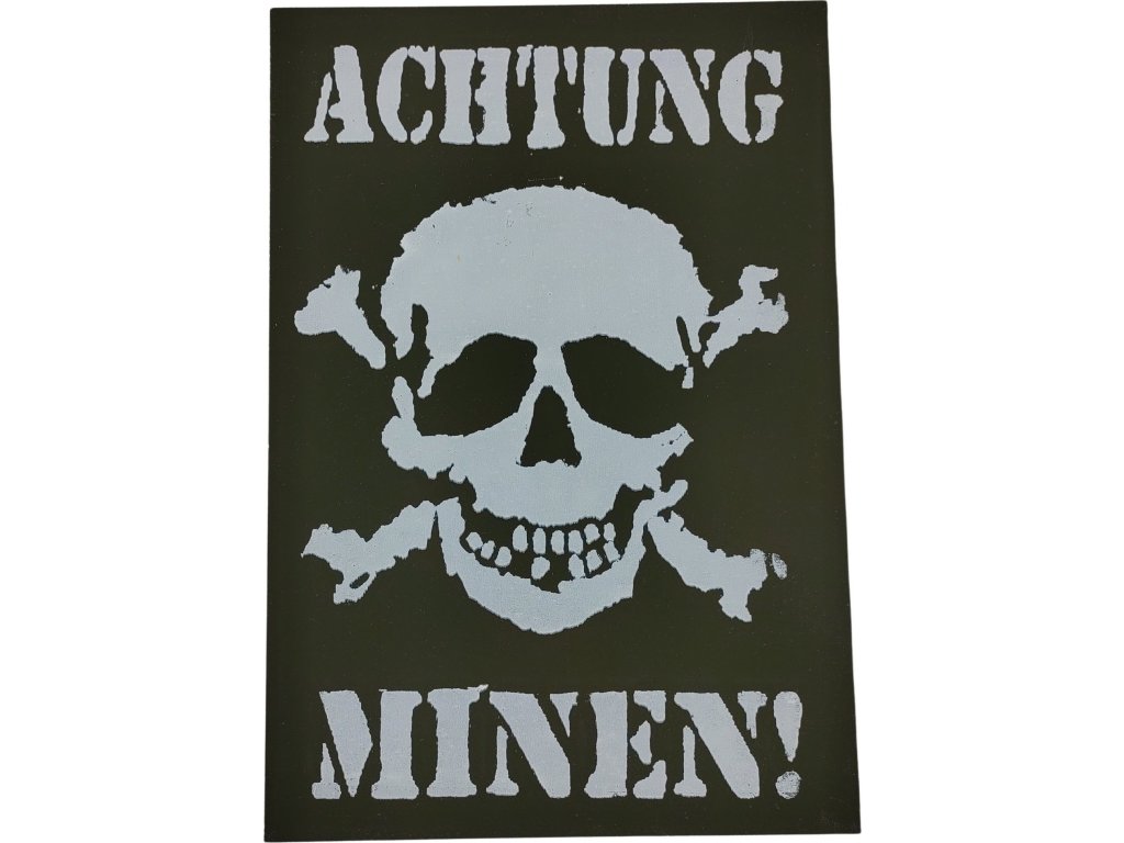 - Zelený podklad s bílým nástřikem lebky s německým nápisem ACHTUNG MINEN!, což je v českém překladu POZOR MINY!