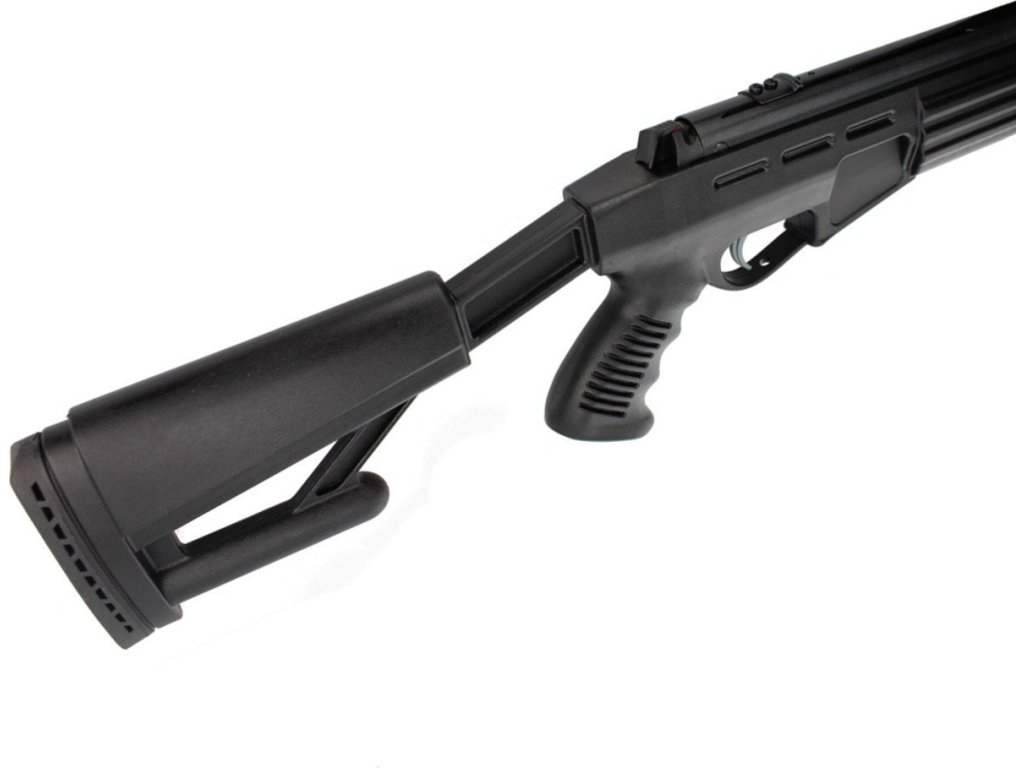 - Polymerová pažba s perforovanou botkou z černé pryže
