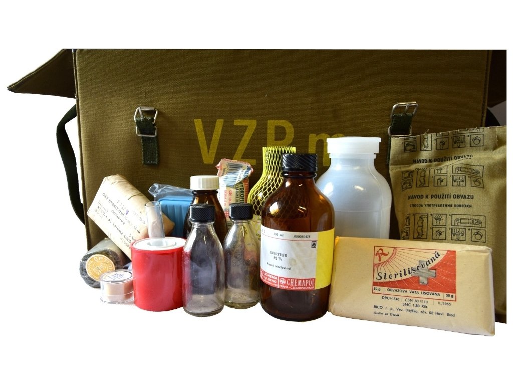 - Brašna obsahuje různé vybavení různého počtu a velikostí (prošlé bez záruky) jako je obvazový materiál, zkumavky, baňky, náplasti, špachtle, škrtidla atd.