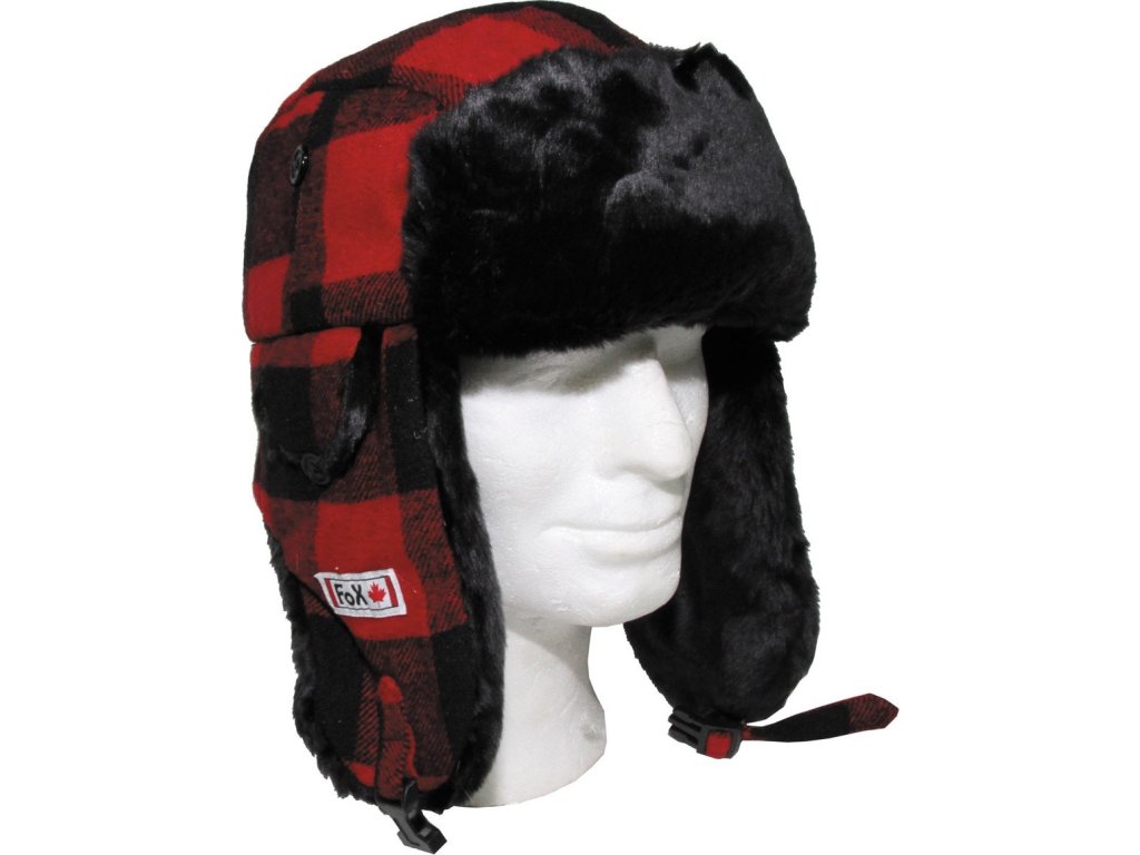 - kožešinová čepice, dřevorubecká, s kožešinou, červeno-černá s malými a velkými klapkami na uši